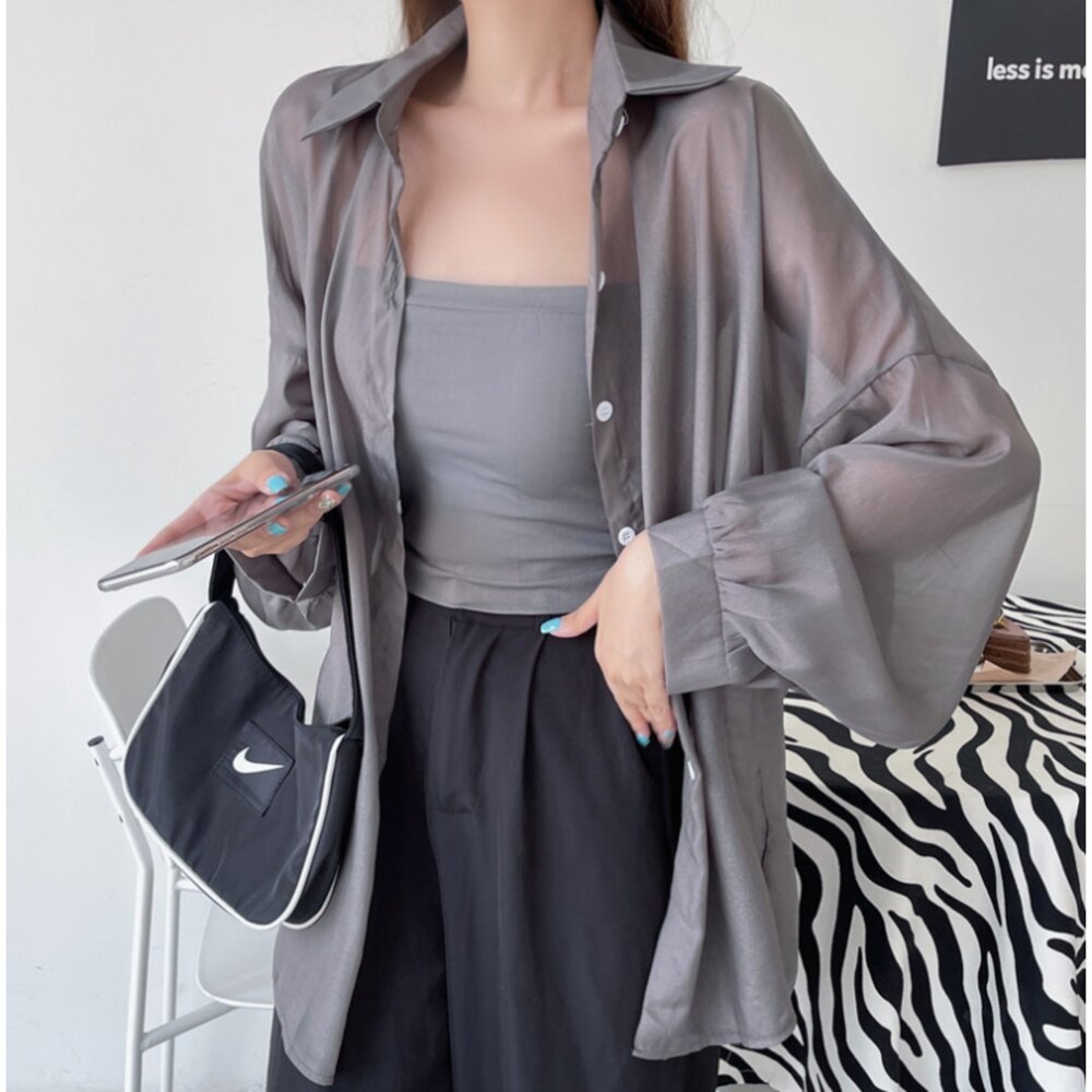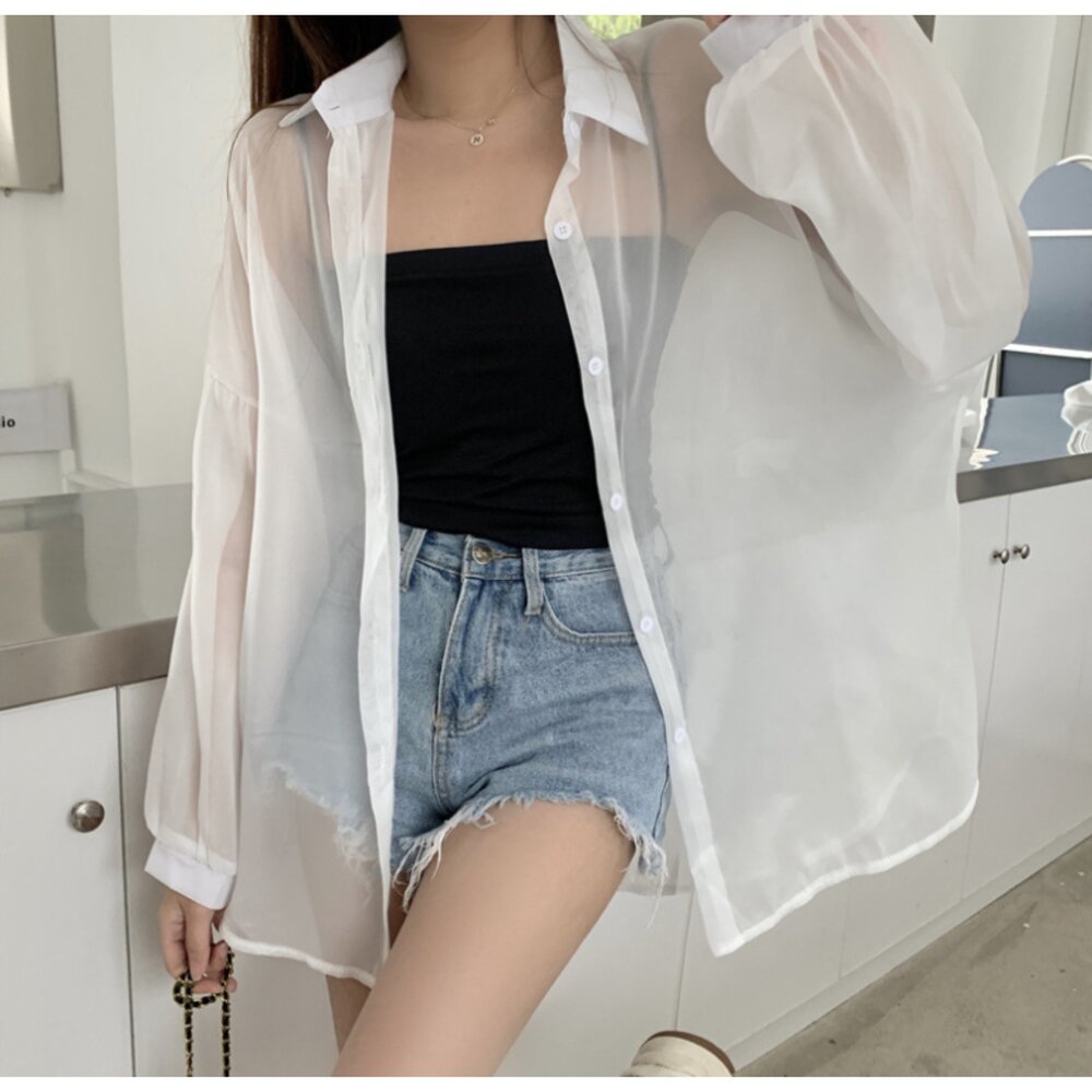 台灣 防曬透膚感襯衫 冰絲感  長袖 罩衫 長袖防曬外套 女裝 防曬襯衫外套 韓版襯衫外套-圖片-1